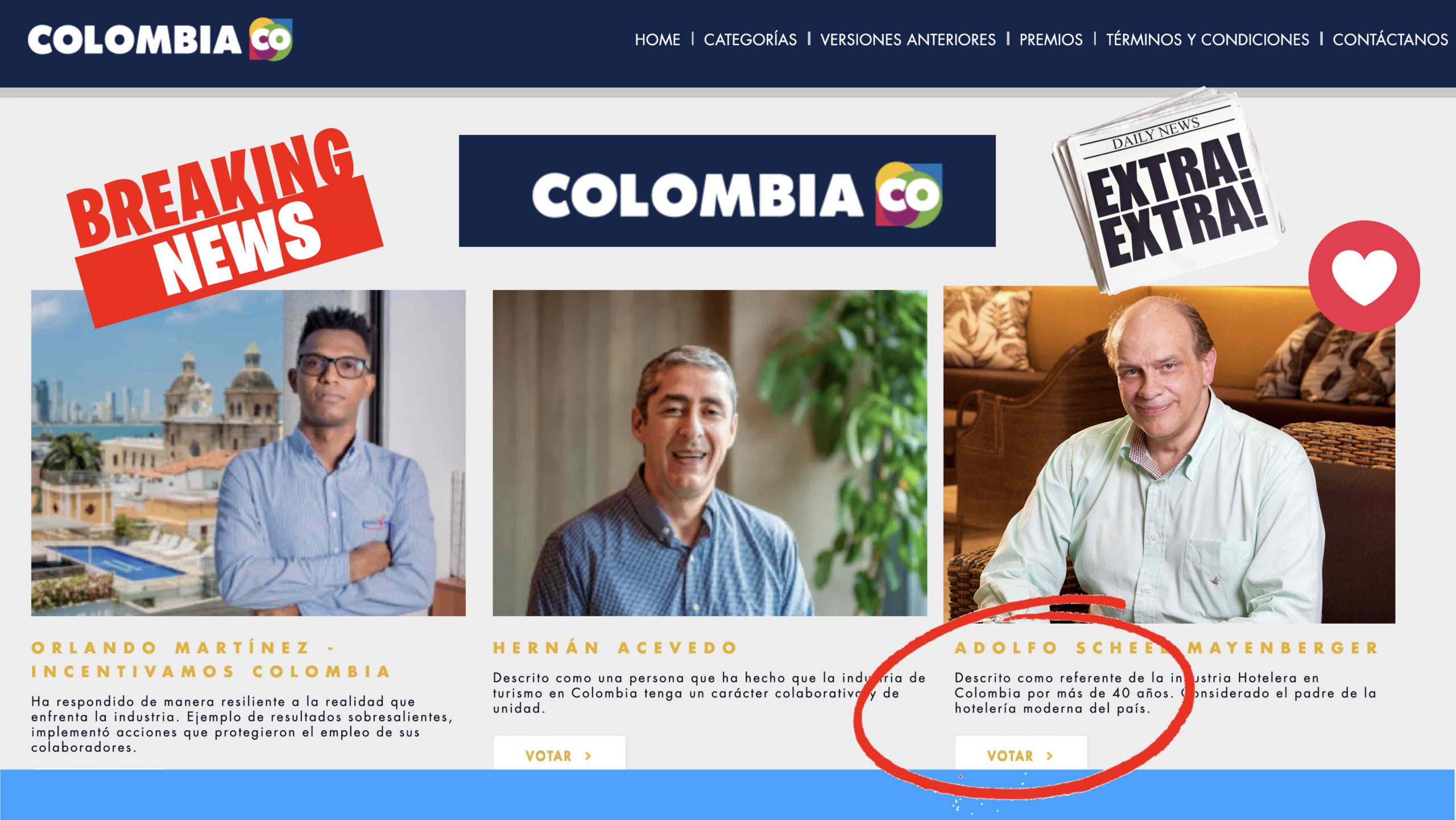 Querida Familia Azul: Queremos compartirles el link donde podrán votar por el Señor Adolfo Scheel como personaje del año el turismo en Colombia, ingresa al siguiente LINK y haz login con tu contraseña de facebook o gmail: https://premios.colombia.travel/votacion-personaje-del-ano IMPORTANTE: SI ESTAS EN UN CELULAR O DISPOSITIVO MOVIL DESLIZA A LA DERECHA EN EL CARRUSEL DE...Read More
